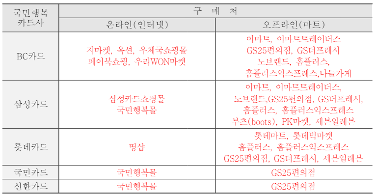 공통적으로는 이마트 에브리데이나 롯데슈퍼는 사용이 불가합니다.